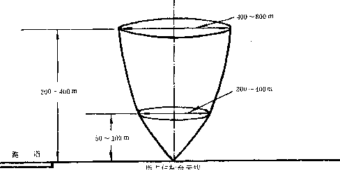 4.3.3 指點(diǎn)信標(biāo)臺向空中發(fā)射垂直扇型波束。其覆蓋區(qū)為,高度50—100m時(shí),縱向?qū)挾葹?00—400m;高度200—400m時(shí),縱向?qū)挾葹?00—800m(圖 5)。